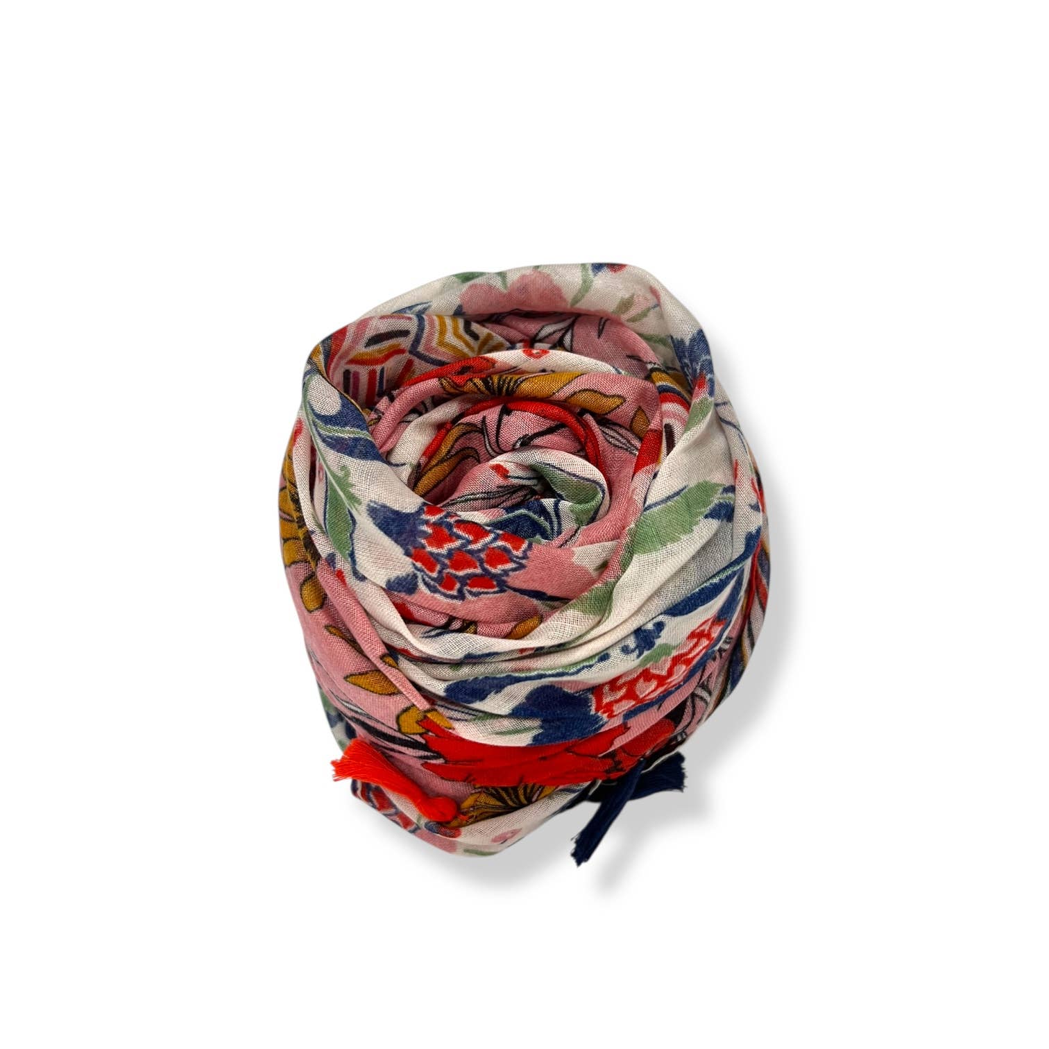 Soft flower-patterned print scarf finished with tassels on each end. Lightweight, and a fabulous layering piece.