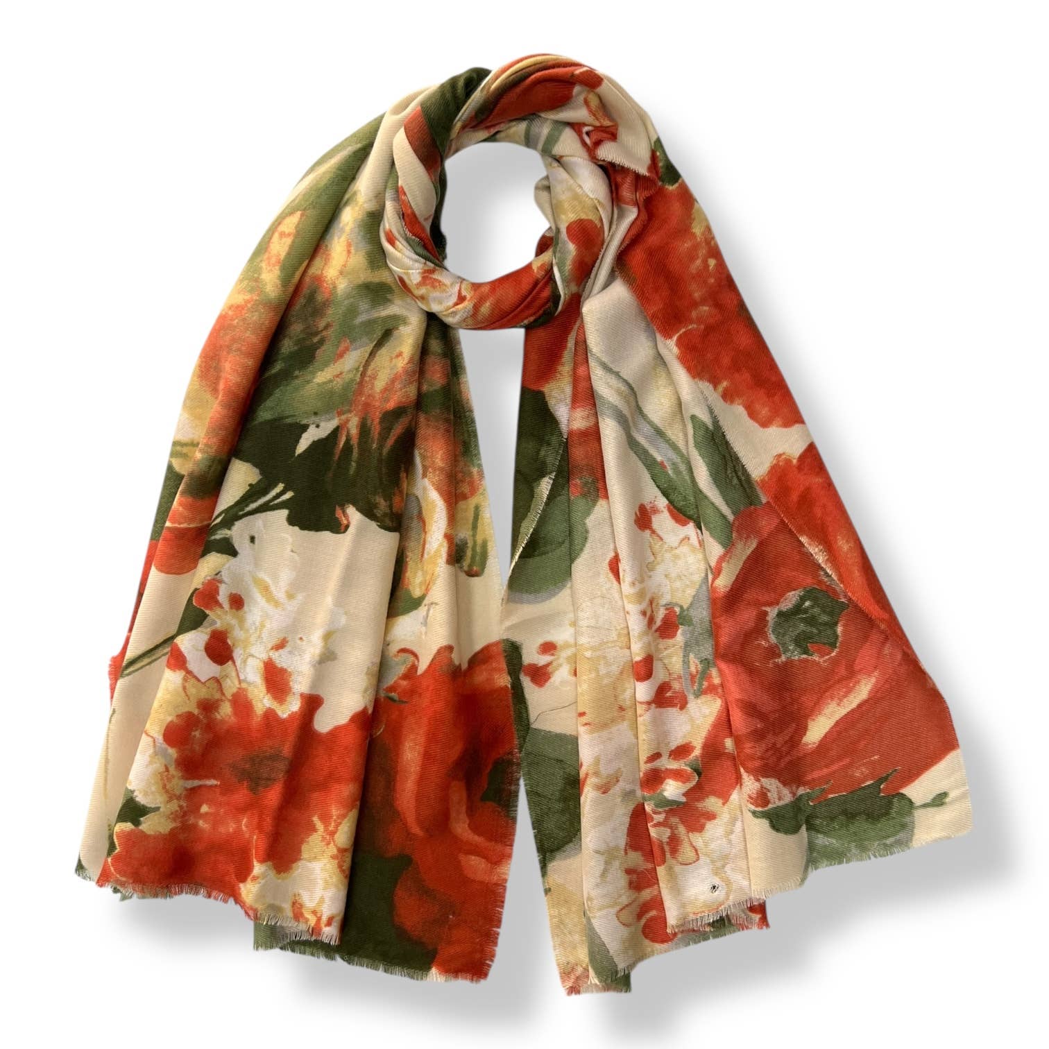 This elegant scarf features a soft watercolour floral design. With chic muted colors making it easy to wear with almost anything day or night.